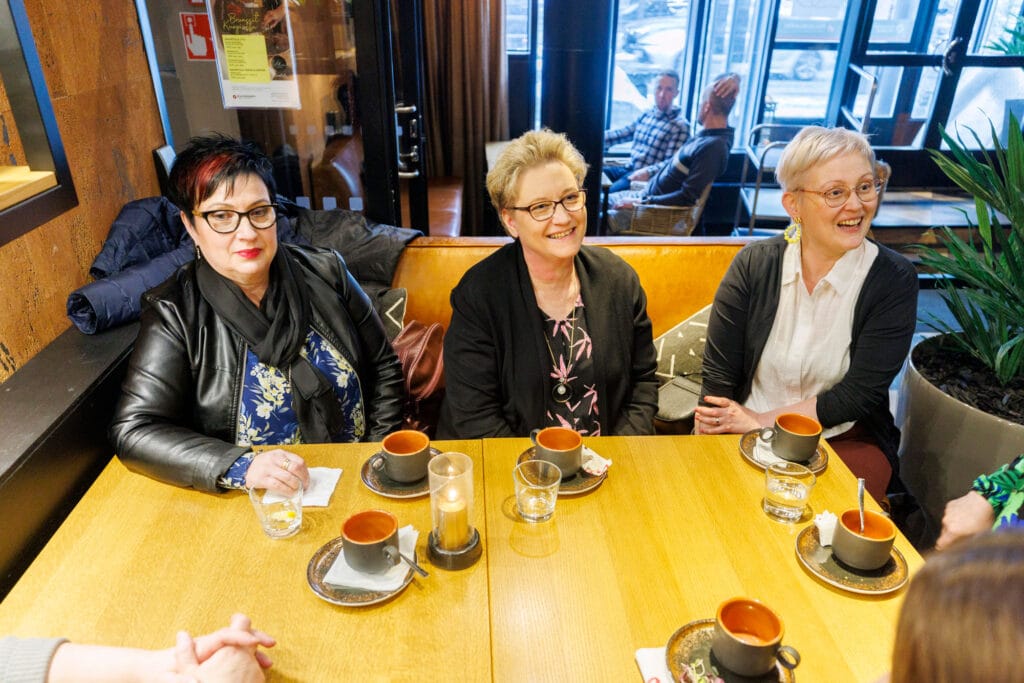 Eräästä pöydästä löytyy tuttuja naisia, Sirpa Karppinen Iisalmesta ja Arja Väisänen Lapinlahdelta. He ovat molemmat PeeÄssällä töissä, ja haluavat osallistua toimintaan myös luottamustehtävän kautta. Heidän seurassaan on edustajistoon uutena jäsenenä noussut Maria Lämsä Kiuruvedeltä.