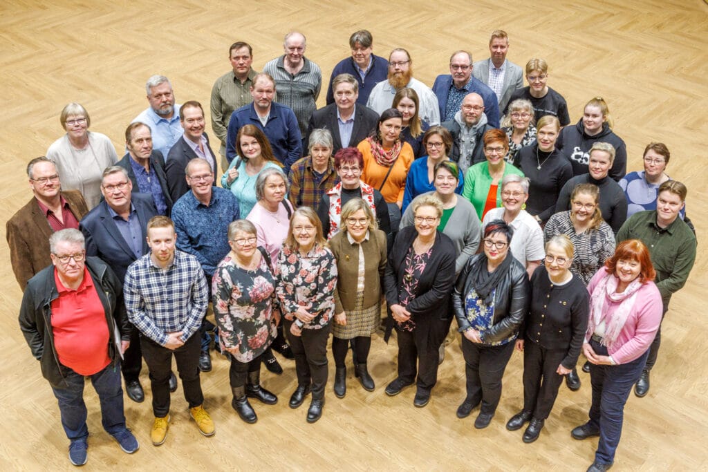 Uuden edustajiston ensimmäisen kokouksen osallistujat paikan päällä Puijonsarvessa. Osa edustajiston jäsenistä osallistui kokoukseen etäyhteyksien kautta.